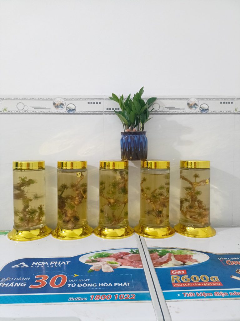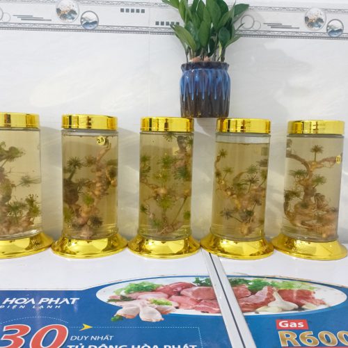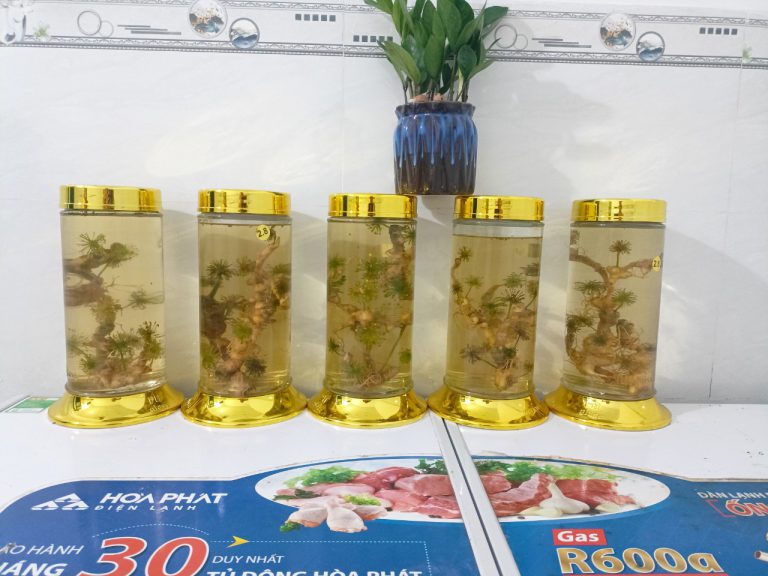 Củ sâm Ngọc Linh kết hoa lên bình chưng biếu tặng.